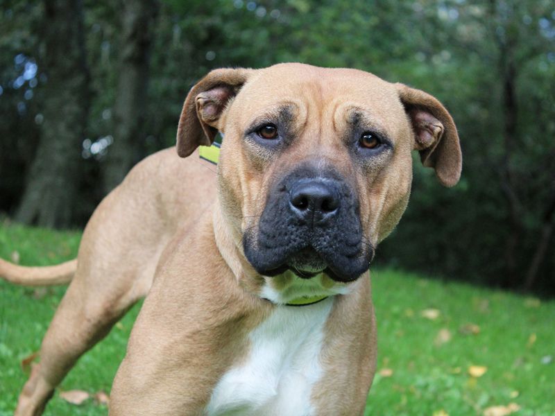 Carla is just shy of a year old but she's lived in a very unstable, unsafe environment. She's already had a litter of puppies and thankfully she can now look forward to feeling safe and loved for herself. Carla was so nervous when she first arrived and it took her a couple of days to begin to trust her carers, but now she knows she's OK she has begun to relax and enjoy her time with us. We're now getting to see this adolescent dog doing the things she should be doing, learning how to play and interact with people and other dogs. She was living with her sister in a house and they squabbled, so for now we're rehoming Carla to be by herself, so she can get to grips with a settled home life and work on her social skills. It would be nice for her to have friends outside of the home that she can practise those skills with, calm and steady dogs. She has been friendly with the ones she's met so she certainly has potential for living with a dog again in the future. As Carla has never been left by herself, her new family will need to be with her most of the time initially, but can work on build up some time alone gradually, so she knows being alone for a little while is nothing to fear.