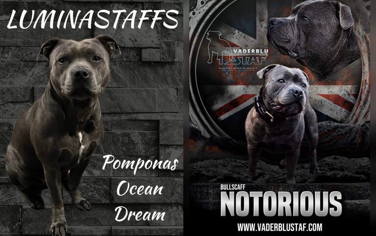 Luminastaffs Pomponas Ocean Dream and Bullscaff Notorious from VaderBluStaf.We are delighted to announce Luna and Dave’s 2nd litter of pups together. Luna has given birth to 7 puppies 3 girls and 4 boys all blue in colour with different chest markings ( see pics ).
