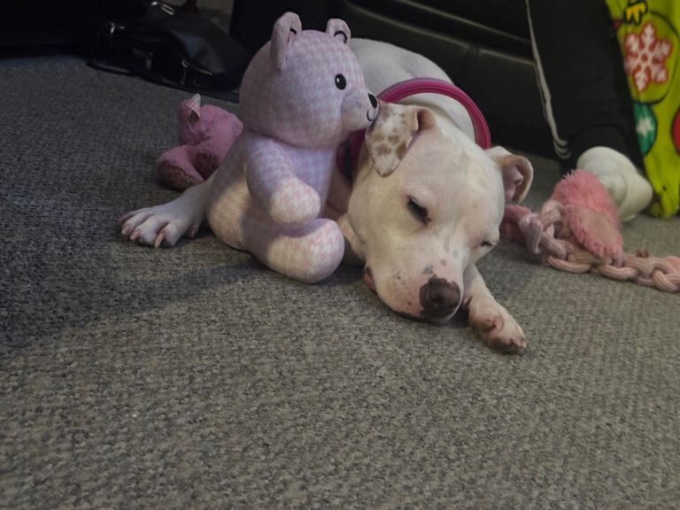Here we have snow a beautiful white Staffordshire bull terrier 18 months old fantastic around my daughters good with other dogs.She’s very playful and full of energy love is going on long walks but also enjoys to pull so will need a little training but fully house trained and she’s absolutely brilliant in a car while travelling and of course she comes with all her immunities toys bowls and bedding.