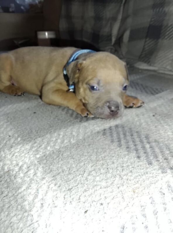 We have had a litter of 8 Staffordshire bull terriers. Mums a staff cross lab black and dads a blue staff. Pictures included. We have 2 brindle girls left for sale. Born on the 23/9/25. Have just opened there eyes and are doing really well. Will be microchipped but not vaccinated when sold
